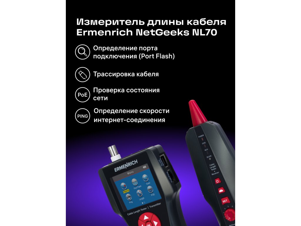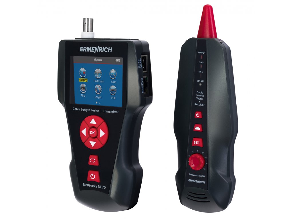 Detektor dĺžky káblov Ermenrich NetGeeks NL70 je multifunkčný merací prístroj určený na testovanie rôznych sieťových káblov kategórie 5E/6E, telefónnych káblov, koaxiálnych káblov a bežných vodičov. Používa na testovanie káblov s dĺžkou až 1 000 m. V balení detektoru nájdete 8 diaľkových jednotiek s ktorými, môžete uskutočňovať 8 súčasných meraní.