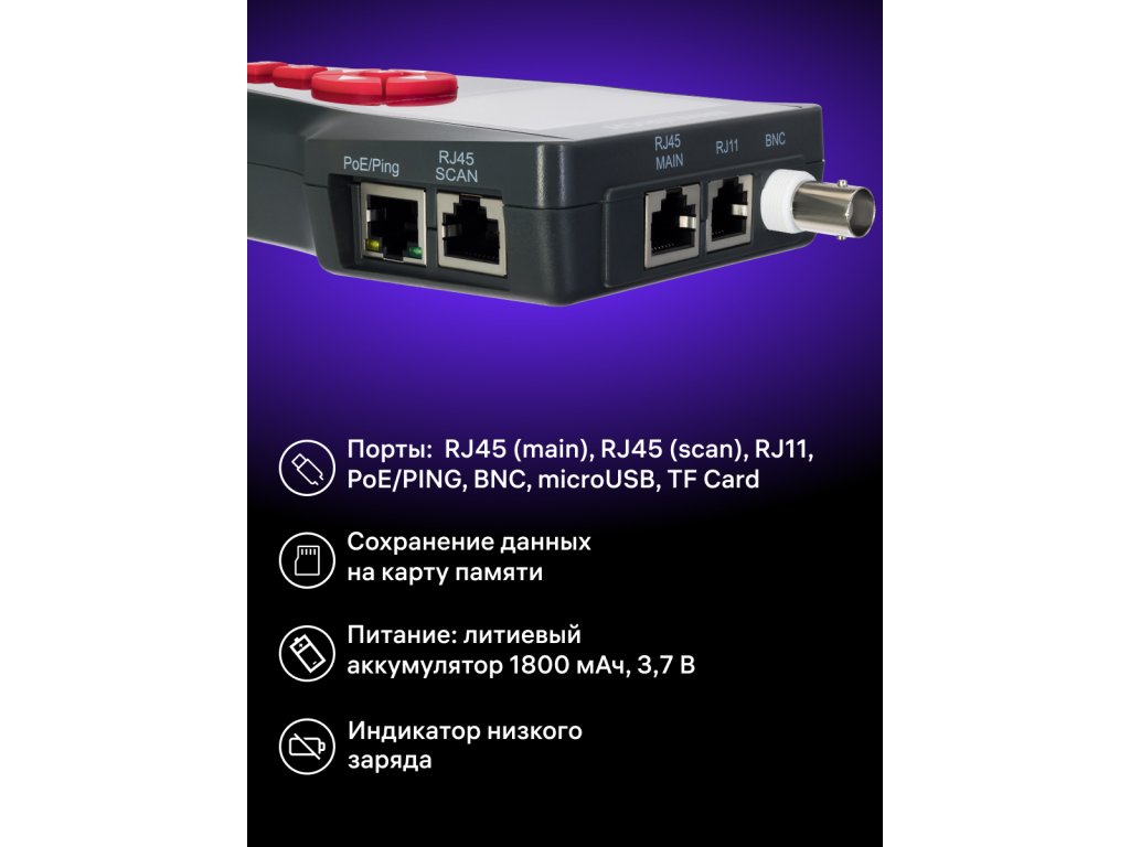 | Testovanie káblov: | + (prerušené obvody, skraty, skrížené dvojlinky, obrátené dvojlinky, rozdelené dvojlinky, presluchy) |