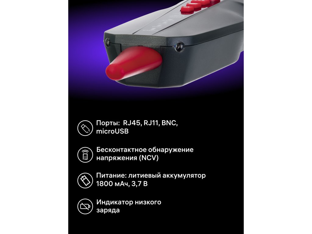 | Testovanie typov káblov: | Sieťový kábel STP/UTP (CAT5E, CAT6E), telefónny kábel, koaxiálny kábel, bežné vodiče |