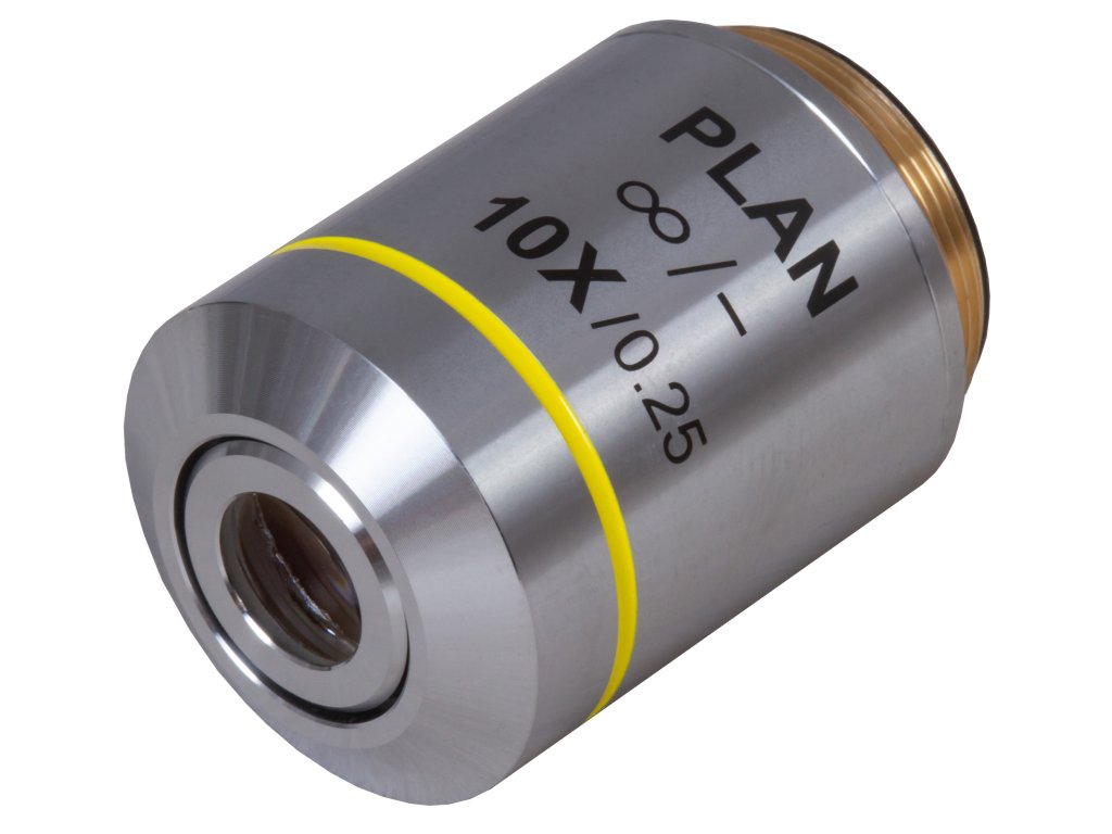 Rovinný achromatický objektív s korekciou na nekonečno Levenhuk MED 10xTento kvalitný rovinný achromatický objektív vyniká výbornými optickými vlastnosťami a disponuje možnosťou zväčšenia 10x. Achromatická rovinná optika je vyrobená z vysoko kvalitného optického skla. Jej schopnosťou je dokonalé korigovanie zakrivenia poľa prostredníctvom sploštenia zorného poľa, výrazné zlepšenie kontrastu, jasu a farebnosti zobrazenia. Objektív má kovovú konštrukciu, ktorá slúži na predlženie jeho životnosti a zvýšenie odolnosti voči náhodným nárazom alebo inému poškodeniu.