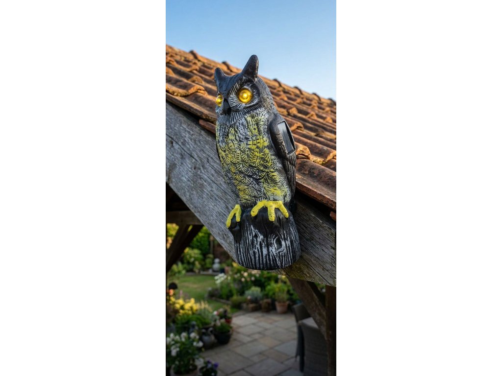 Solárne napájaná sova so svietiacimi očami a zvukom. Solárny panel je bezpečne pripevnený na zadnej strane. Umiestnite tento solárne napájaný strašiak na vtáky do svojej záhrady, aby ste odplašili nežiaduce vtáky. Skvelé miesta na umiestnenie plašiča vtákov sova je tak tiež strecha budov, studňa, altánok. Svietiace oči zachytia slnečné lúče a prilákajúvtáky do jej blízkosti. Veľká plašička Sova je vyrobená s vysokokvalitného plastu, ktorý je odolný voči UV žiareniu.Výška sovy je 41 cm. Váha: 0, 95 kg.