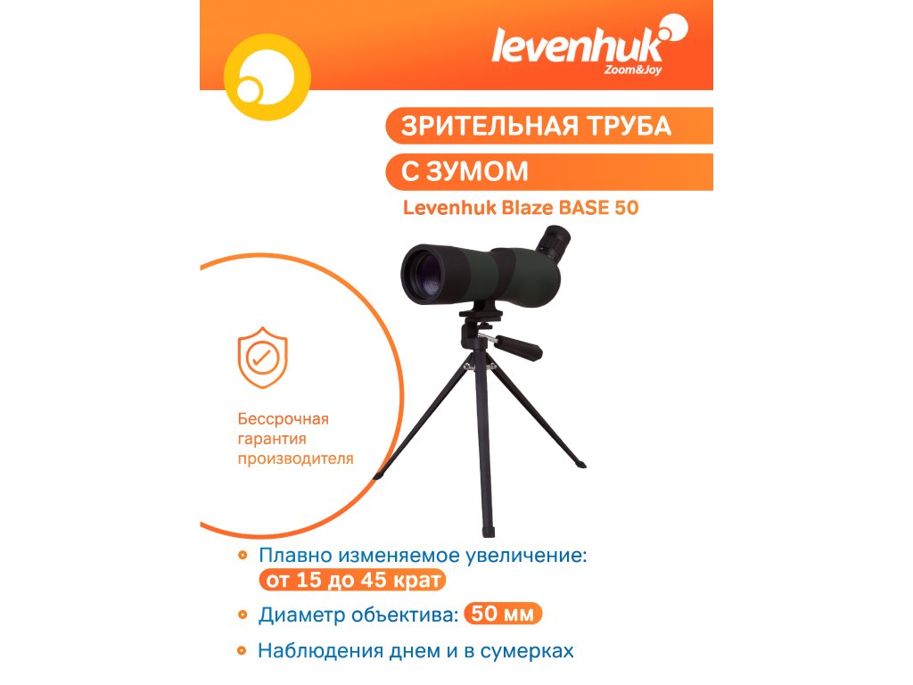 Spektív Levenhuk Blaze 50 BASE s funkciou nastaviteľného priblíženia.Šikmý okulár ponúka veľmi pohodlné pozorovanie nadhlavníkovej oblasti.K dispozícii je aj funkcia dioptrickej korekcie na okulári. Vodotesný plášť je z odolného a spoľahlivého plastu. Umožňuje použitie aj v horšom počasí, mimochodom spoľahlivo chráni optiku pred náhodnými otrasmi. Pomocou tohto spektívu je možné robiť snímky pozorovanej scenérie. Jeho konštrukcia umožňuje inštalovať fotoredukciu.Sada obsahuje malý stolový statív. Počas pozorovania pri vysokom zväčšení, odporúčame inštalovať prístroj na statív. Pomôže vám to zabrániť chvenie obrazu, s ktorým sa bežne stretávame pri pozorovaní z ruky.