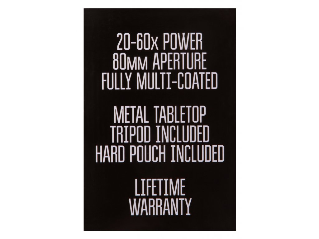 Zväčšenie: 20-60x. Priemer objektívu: 80 mm.