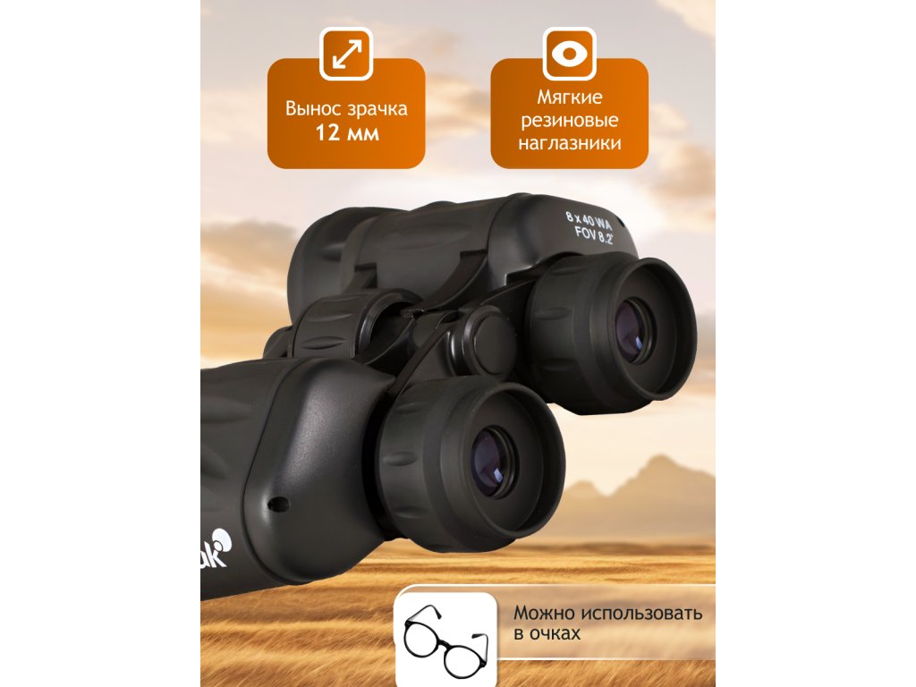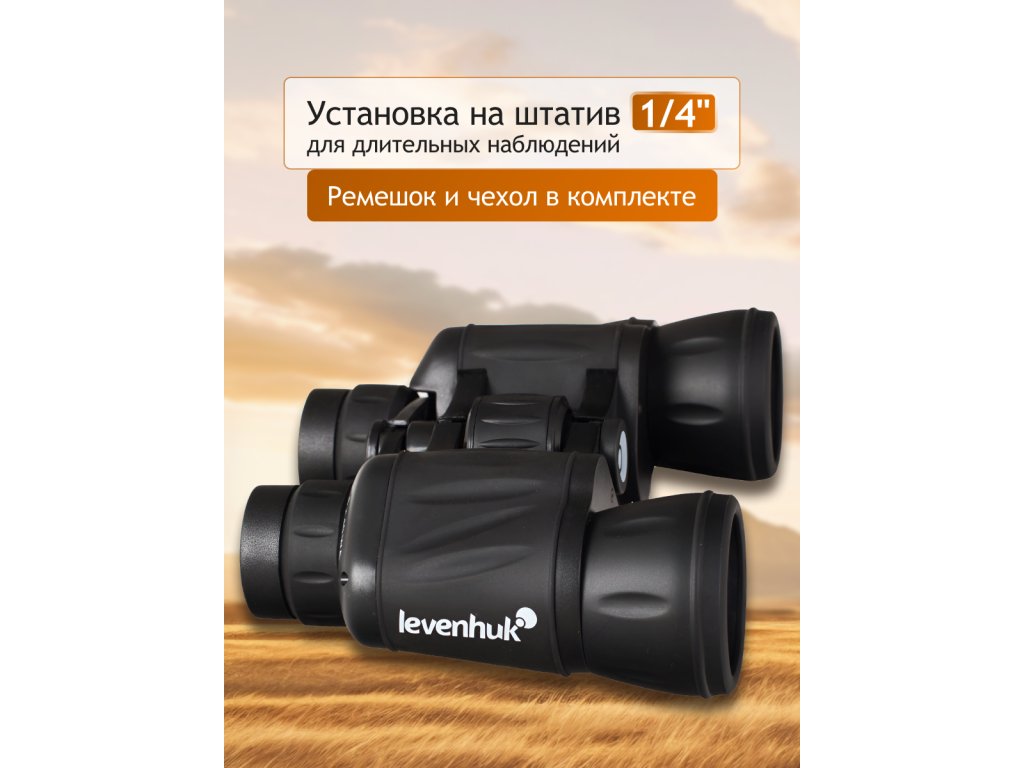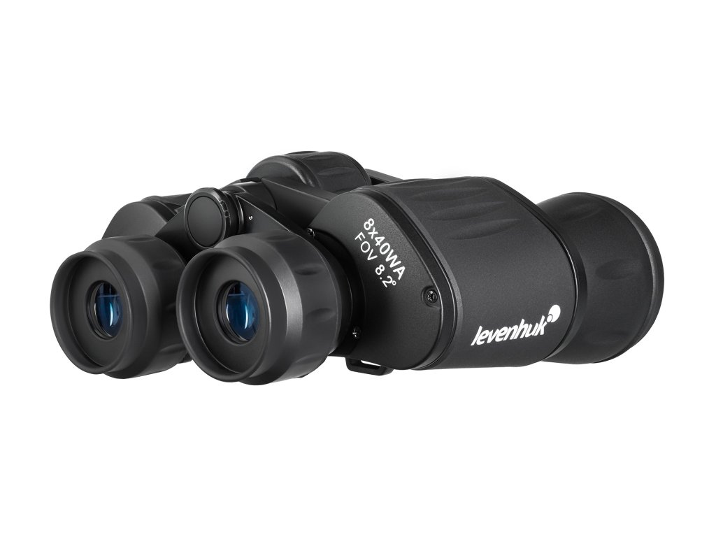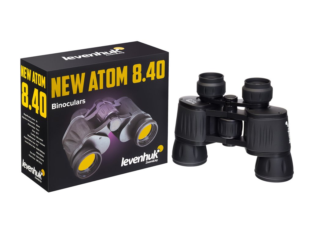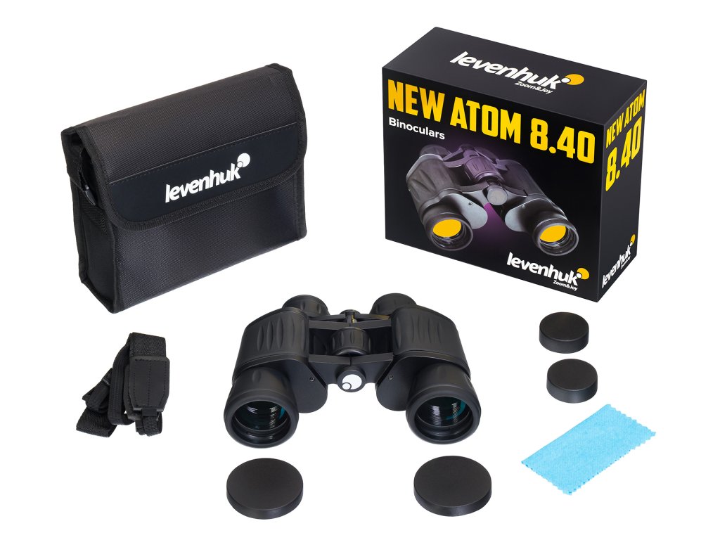Levenhuk New Atom 8x40 binoculars come with essential accessories for comfortable use: protective eyepiece and objective lens caps, a strap, a microfiber cleaning cloth for optics, and a storage pouch.