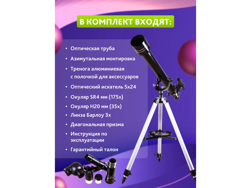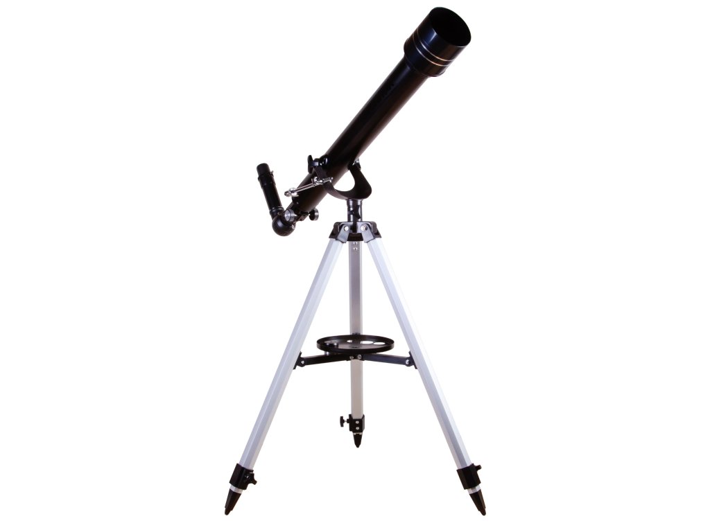 Levenhuk Skyline BASE 60T je hvezdársky ďalekohľad používaný pre pozorovanie vzdialených objektov, ako je Mesiac, Venuša, tmavé a dvojité hviezdy alebo pozemské objekty. Môžete ho využiť na pozorovnie objektov na zemi ako aj na oblohe. Začínajúci astronómovia alebo deti, ktorý sa zaujímajú o vedu, určite naplno ocenia tento teleskop. Vďaka jednoduchej prevádzke a rozšírenej príbalovej sade je tento teleskop skvelou voľbou pre pre voľnočasové pozorovanie vzdialených objektov, a bude žiadaným darom pre mnohých nadšencov pozorovania. Vo vnútri hvezdárskeho ďalekohľadu je pevná plne opláštená sklenená optika. Objektívi prenášajú ostrý a jasný obraz pre pozorovateľa, dokonca aj tmavé objekty sú vykreslené v dobrej kvalite. Optický tubus je nainštalovaný na alt-azimutálnej montáži. Netrvá to dlho, než sa naučíte princípu fungovania. Obsluha teleskopu je veľmi jednoduchá a zvládnu to aj deti. Optický hľadáčik je schopný presne zamerať objekty na oblohe aj obzore, dodáva sa v spoločnej súprave a poskytuje aj 5x zväčšenie. V balení nájdete okrem hľadáčiku aj ďalšie príslušenstvo: Okulár s krátkou ohniskovou vzdialenosťou dokážte zväčšiť až na 175x, druhý okulár s dlhou ohniskovou vzdialenosťou ponúka zväčšenie na úrovni 35x. Čím je zväčšenie väčšie, tým bližšie a detailnejšie je pozorovaný objekt, malé zväčšenie umožňuje pozorovanie rozšírených objektov. Súčastou balenia je aj diagonálny hranol, pre komfortné a čisté pozorovanie. Pre montáž teleskopu sa používa pevný a stabilný hliníkový statív, ktorého výšku si dokáže upraviť podľa vašich preferencií.