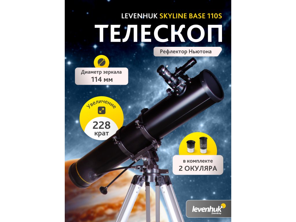 Teleskop Levenhuk Skyline BASE 110S je Newtonov reflektor dodávaný v bohatej sade. Príslušenstvo v sade bolo starostlivo vyberané, aby mal pozorovateľ čo najväčší zázitok z pozorovania a mal možnosť využiť všetký možnosti dodanej optiky. Tento teleskop využijete pri pozorovaní mesačných kráterov o veľkosti 5km, prstencov Saturnu, fáz Merkúru aj atmosférických fenoménov Jupitera. Optika tohto teleskopu je ako stvorená pre pozorovanie dvojitých hviezd, guľovitých klastrov a roptýlených a planetárnych hmlovín. Levenhuk Skyline Base 110S je skvelý na pozorovanie hlbokého a vonkajšieho vesmíru a pozorovanie nočnej oblohy.