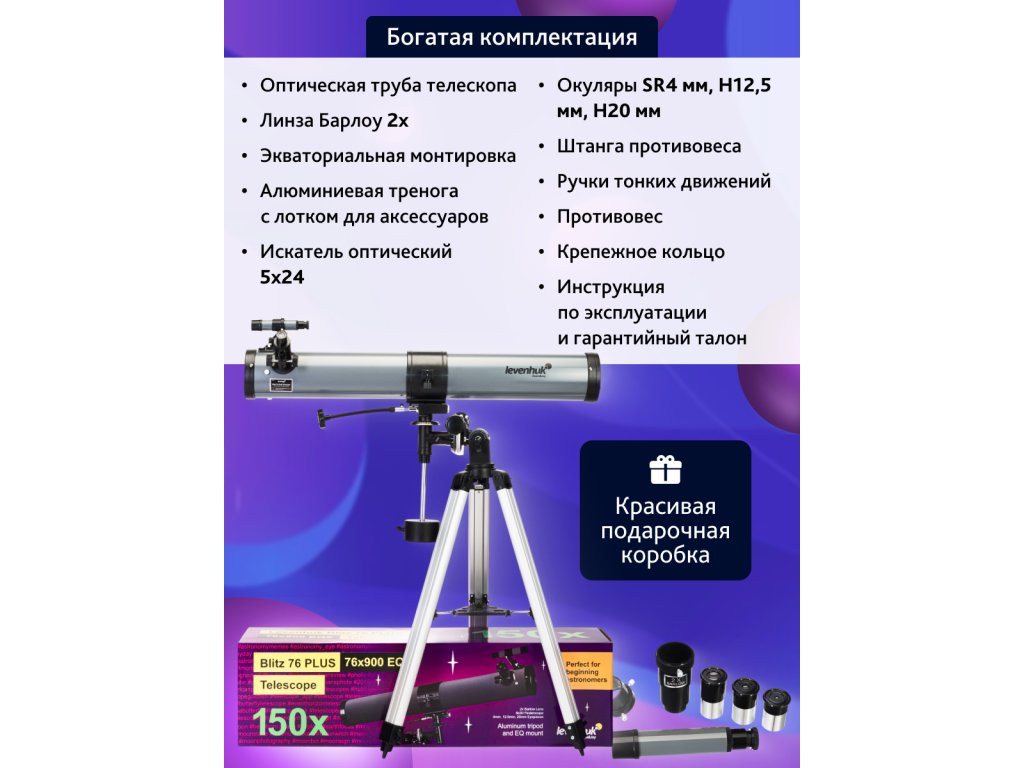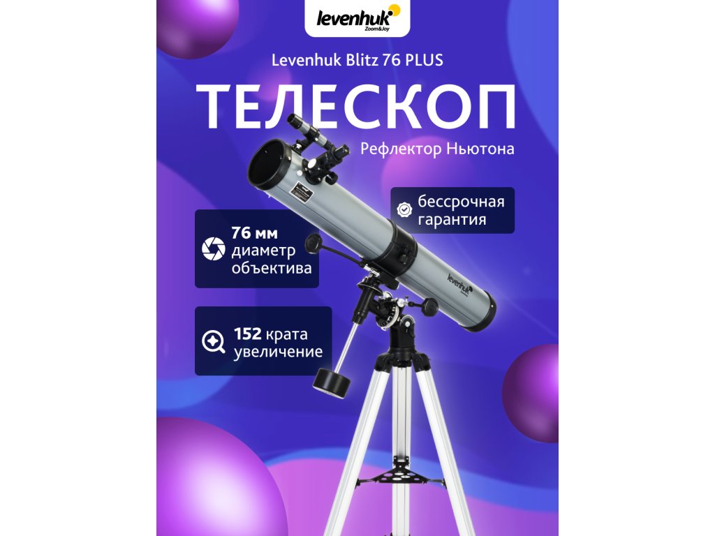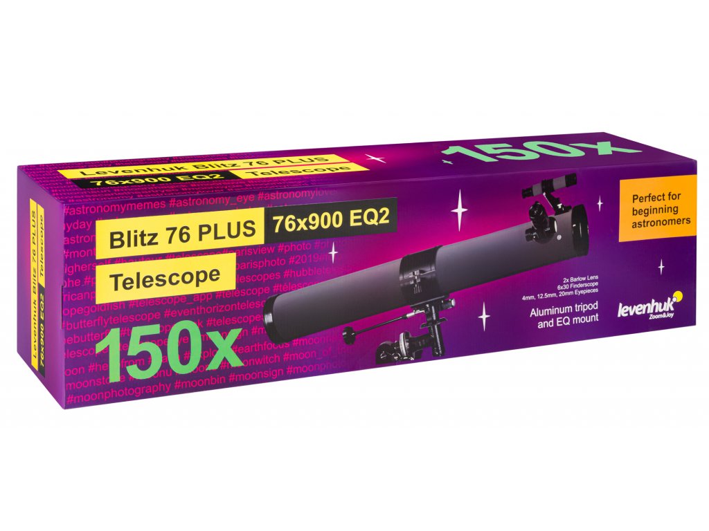 Tento skvelý Newtonov reflektor Levenhuk Blitz 76 PLUS sa inštaluje na paralaktickú montáž. Hvezdársky ďalekohľad je ideálny pre začiatočníkov, ktorí sa zaujímajú o skúmanie objektov hlbokého vesmíru. Skvelý kvalitný pozorovací ďalekohľad disponuje apertúrou 76 mm a ohniskovou vzdialenosťou 900 mm. Teleskop pre začiatočníkov Levenhuk Blitz 76 PLUS disponuje optikou vyrobenou z vysoko kvalitného optického skla BK-7, vďaka ktorej je možné relatívne dobre pozorovať nočnú oblohu, hviezdy a mnoho ďalších objektov. Taktiež umožňuje pozorovať medziplanetárny priestor, predovšetkým mesiac a podobne.