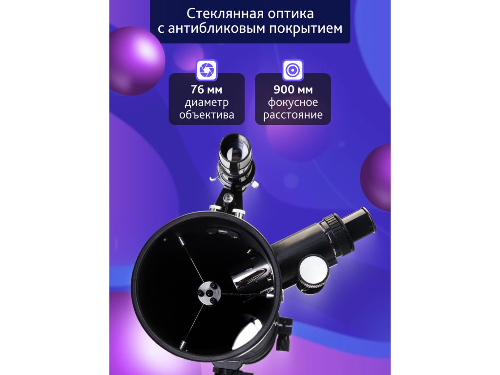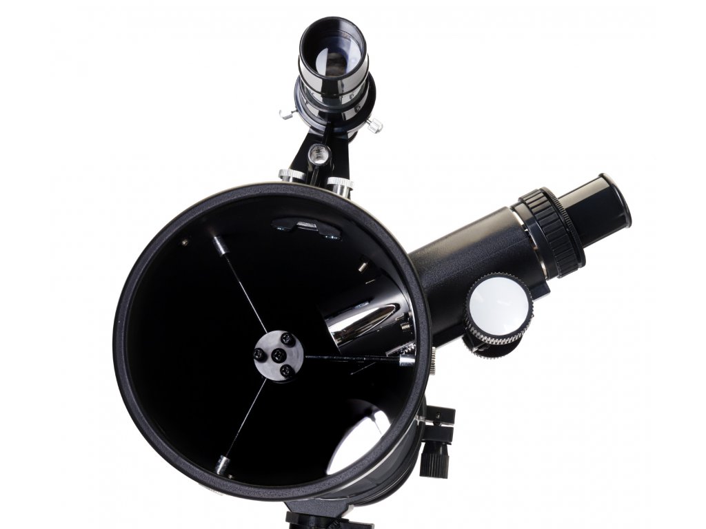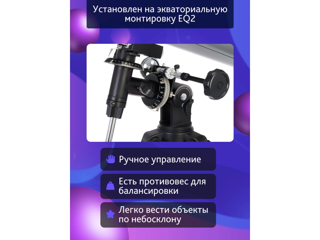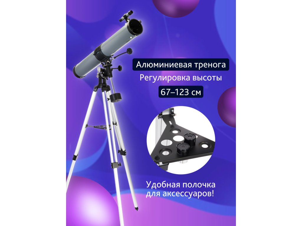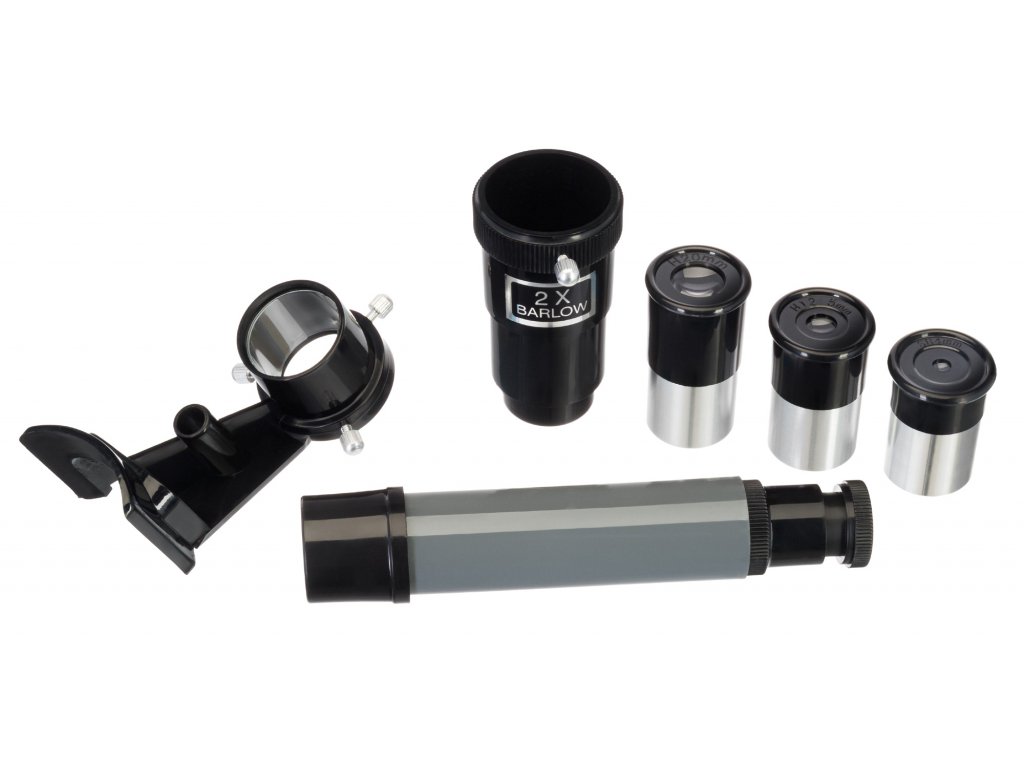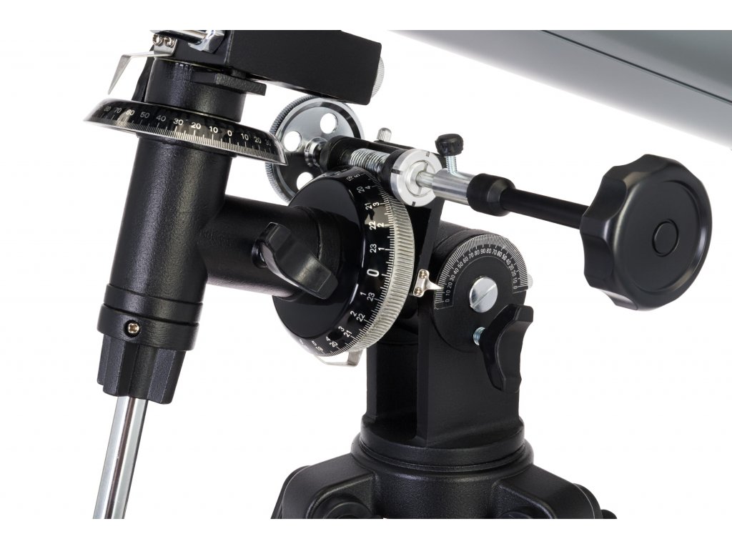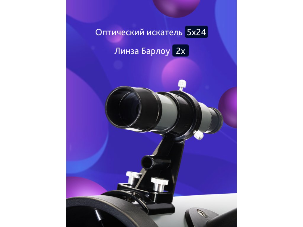 Teleskop pre začiatočníkov je vybavený sférickým primárnym zrkadlom, šošovky chráni špeciálna antireflexná vrstva povrchovej úpravy. Vesmírnym teleskopom je možné pozorovať až do najväčšieho praktického zväčšenia, pričom dosiahnete jasný a ostrý obraz s minimálnym skreslením. Paralaktická montáž vybavená ovládacími gombíkmi s pomalým pohybom umožňuje sledovanie kozmických telies aj počas ich pohybu po nočnej oblohe. Statív vesmírneho ďalekohľadu je vyrobený z hliníka, nohy majú nastaviteľnú výšku a uprostred sa nachádza ovládacia priehradka na príslušenstvo.