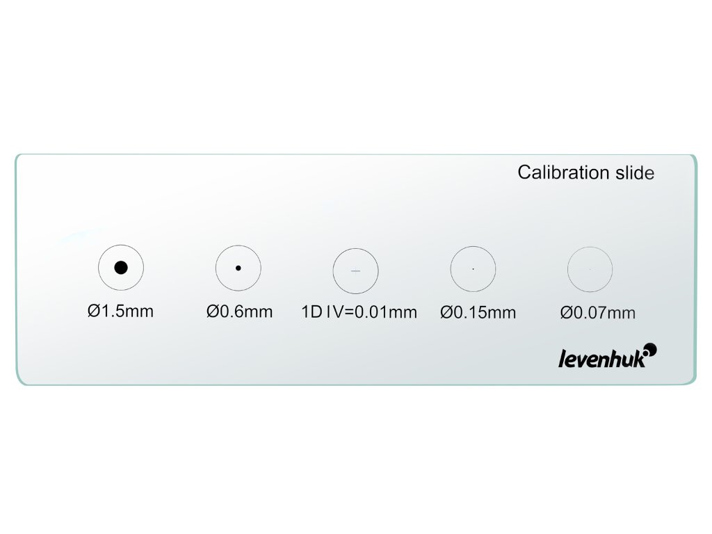 Kalibračné sklíčko Levenhuk MED X/Y je kus priehľadného skla. Mikrometrická stupnica je umiestnená uprostred. Minimálna veľkosť dielika stupnice je 0,01 mm. Na oboch stranách stupnice sú kruhy s rôznymi priemermi - 1,5 mm, 0,6 mm, 0,15 mm a 0,07 mm. Kalibračné sklíčko je špeciálne navrhnuté na kalibráciu mikroskopov, čo vám umožní presne určiť veľkosť a vzdialenosti medzi skúmanými preparátmi. Je to obzvlášť dôležité pri kvantitatívnych výskumoch, kde je nevyhnutná vysoká úroveň presnosti.