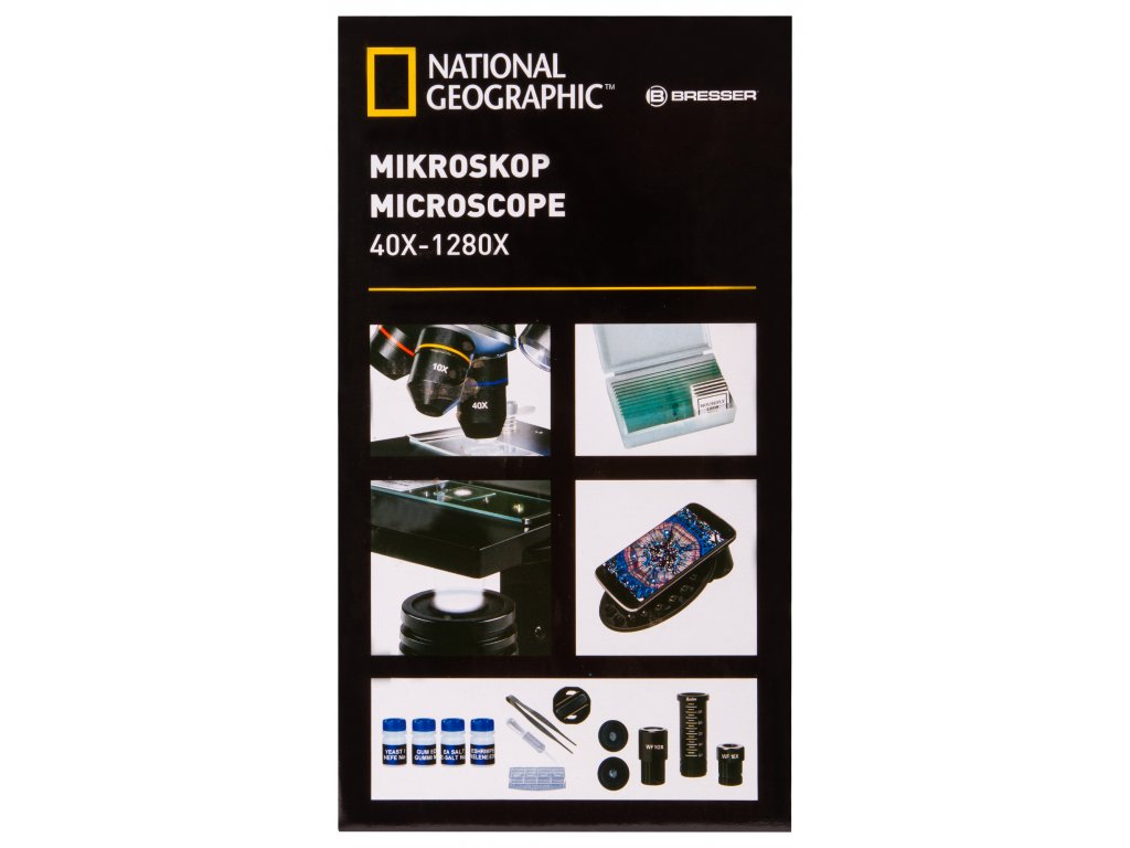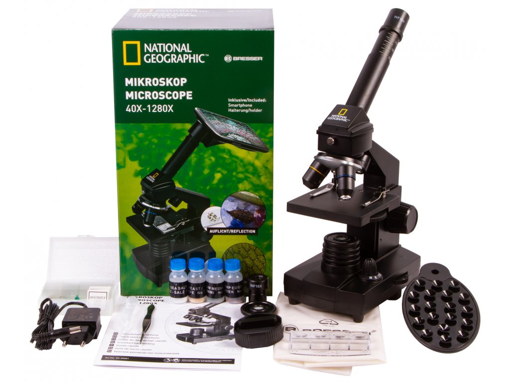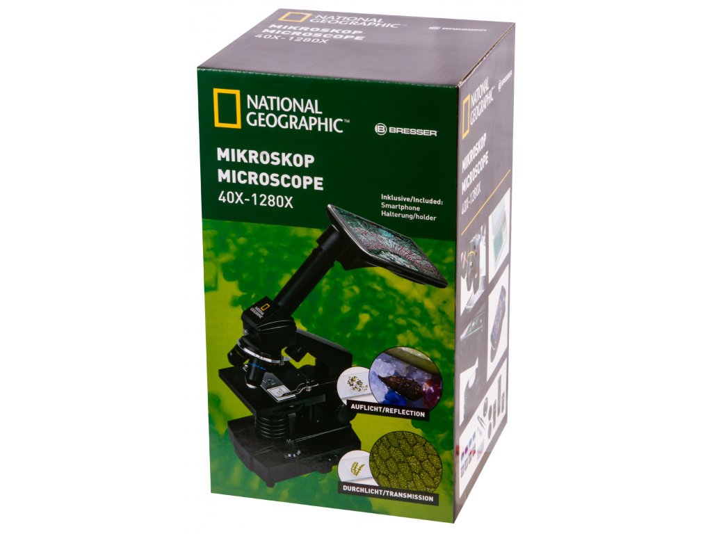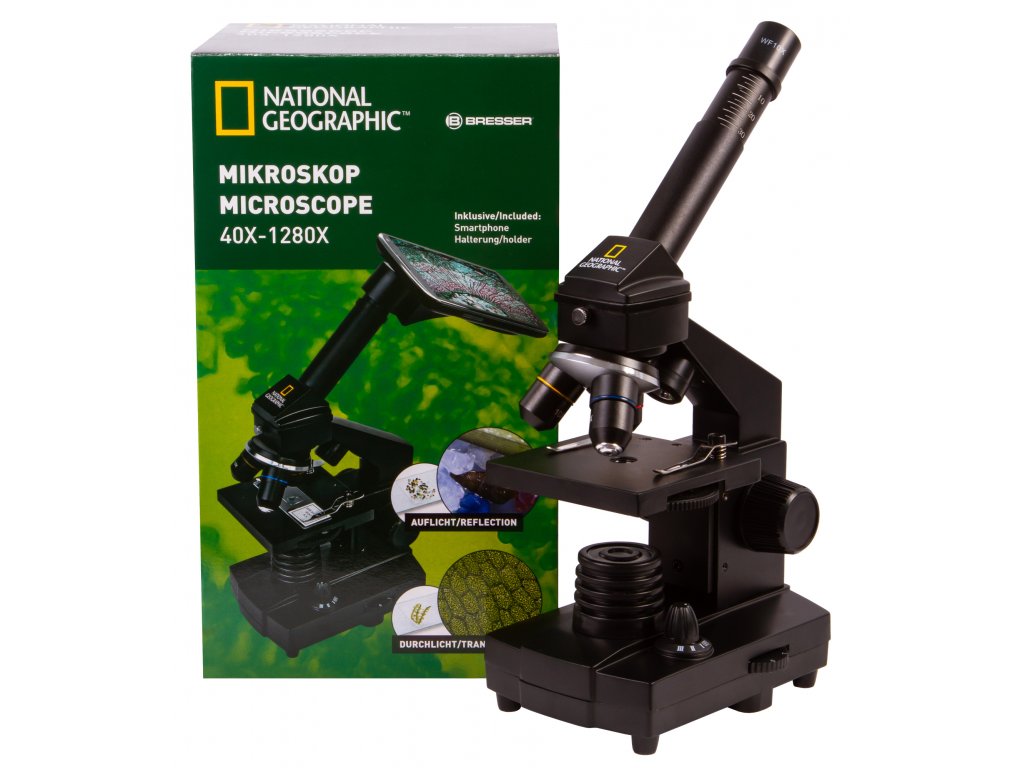 Biologický mikroskop. Zväčšenie 40x-1280x.Mikroskop Bresser National Geographic 40-1280x je biologický mikroskop, ktorý je určený najmä pre začiatočníkov, ale nesklame ani skúsenejších biológov. Disponuje širokým rozsahom zväčšenia v rozmedzí od 40x do 1280x. Zloženie optického mikroskopu Bresser National Geographic 40-1280x zahŕňa otočnú hlavicu a kombinované osvetlenie, ktoré umožňuje pozorovanie priehľadných aj nepriehľadných vzoriek pomocou prenášaného a odrazeného svetla.