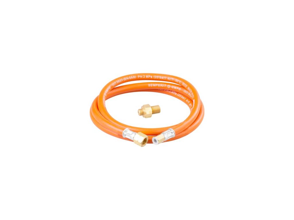 Pripojovací set s 1,5 m hadicou s koncovkami G1/4“L – M9 a redukcia 7/16“-G1/4L“, vhodné na prepojenie ohrievača Olymp a variča Dual Compact ku 2 kg propán-butanovej fľaši.