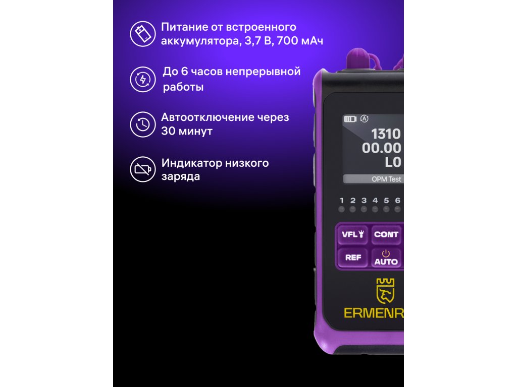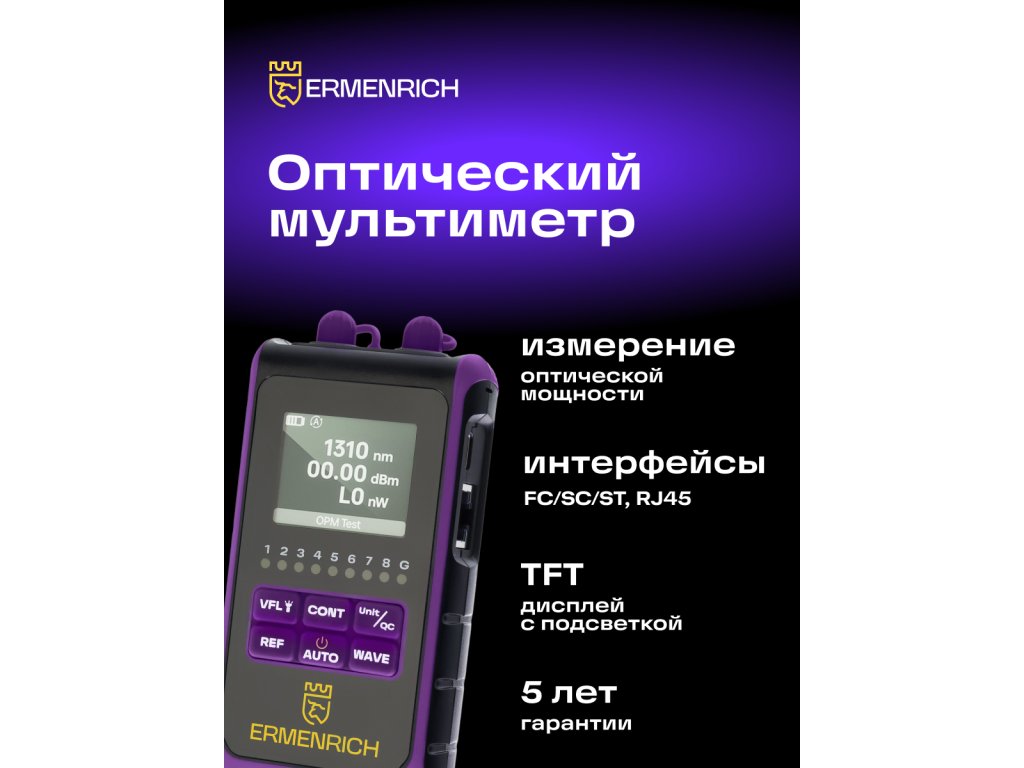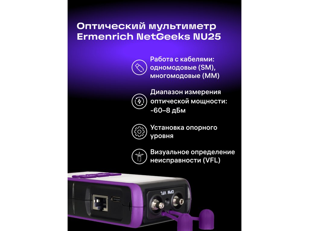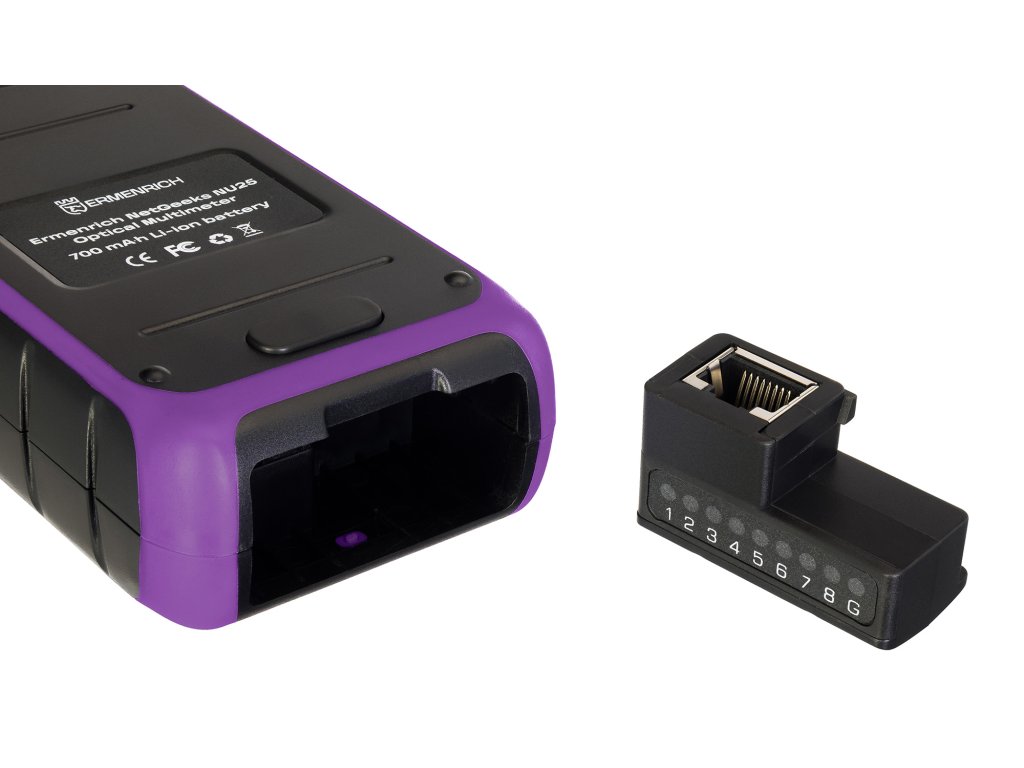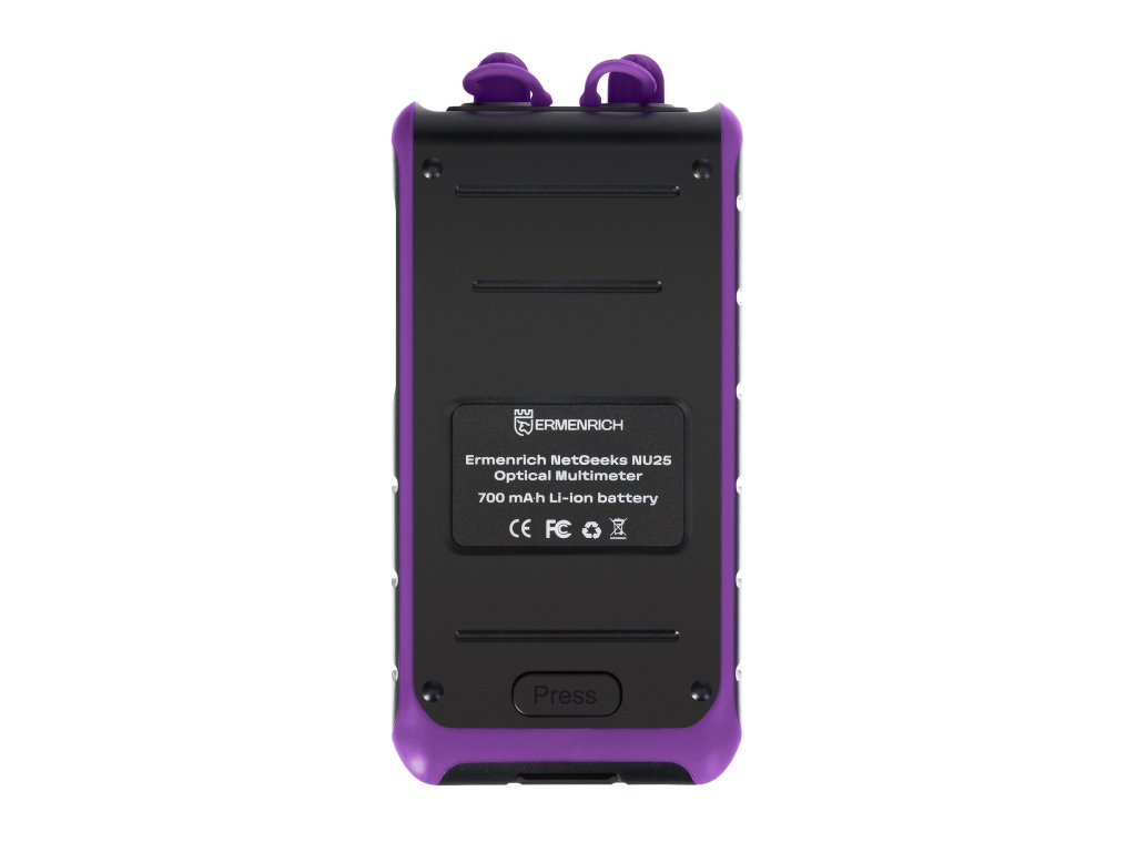 Ermenrich NetGeeks NU25 je optický multimeter, ktorý je multifunkčným zariadením určeným na meranie optického výkonu, vyhľadávanie porúch v káblach a určovanie ďalších charakteristík optických sietí a ich komponentov. Funkcia VFL (Visual Fault Locator) umožňuje hodnotiť poškodenie kábla pomocou svetelných signálov. Tieto signály môžu byť v troch formách: stály svit, pomalé blikanie a rýchle blikanie. Výsledky testovania siete sa zobrazujú na podsvietenom farebnom TFT displeji, ako napríklad test kvality lisovania konektorov alebo frekvencia detegovaného signálu. Konektor zariadenia je chránený proti prachu a vode odnímateľným plastovým krytom.Zariadenie môže pracovať na jednej z šiestich hlavných vlnových dĺžok: 850, 980, 1310, 1490, 1550 alebo 1625nm. Funkcia VFL má samostatnú vlnovú dĺžku 650nm a podporuje detekovateľné frekvencie 270Hz, 1kHz a 2kHz. Zariadenie je vybavené optickými konektormi štandardov FC/SC/ST, ako aj RJ45 sieťovým konektorom. Ermenrich NetGeeks NU25 podporuje jednovidové (SM) a viacnásobné (MM) káble.