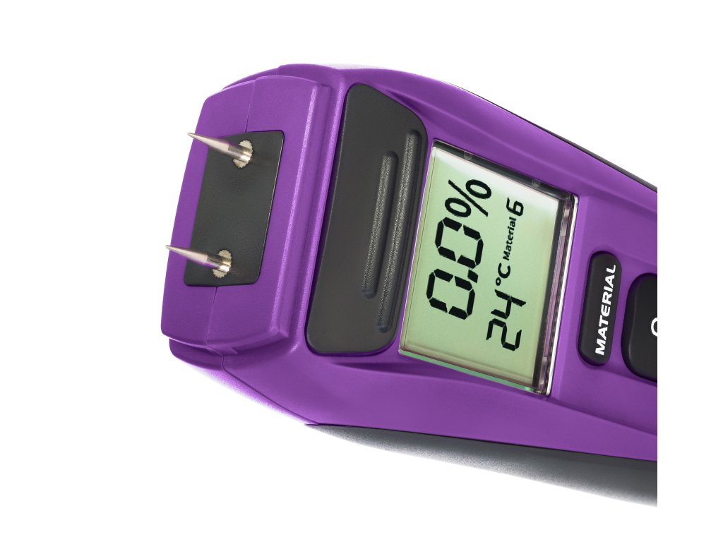 It is a pin-type moisture detector, i.e., the device has two needles that take the measurements. It not only measures the moisture content of the material but also the temperature. You can choose the type of material you are working with. The data is displayed on the built-in monochrome screen and the control buttons are located below.