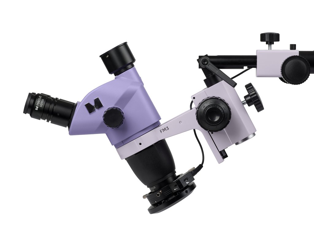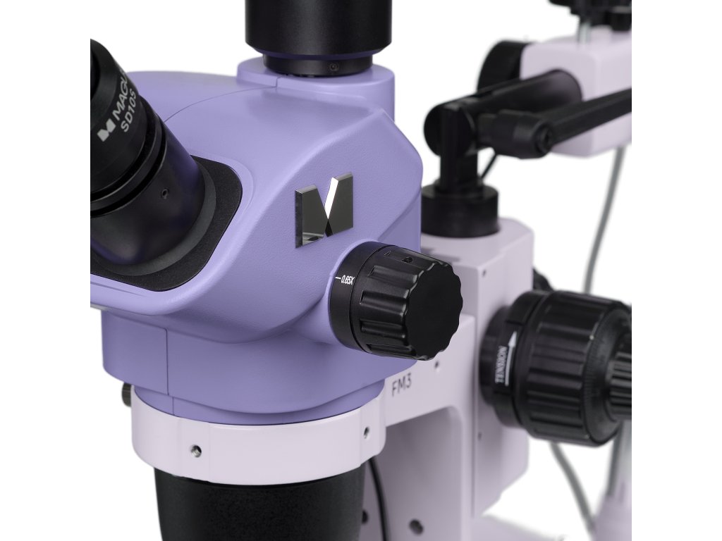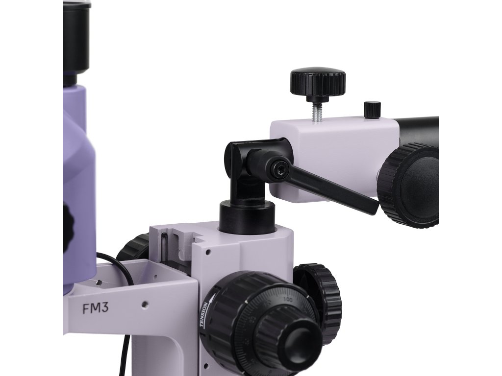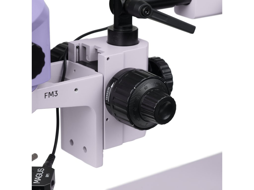 - The universal stand expands the working area, allowing for the precise positioning of the microscope head above the specimen and the fine micro adjustment of the head position.