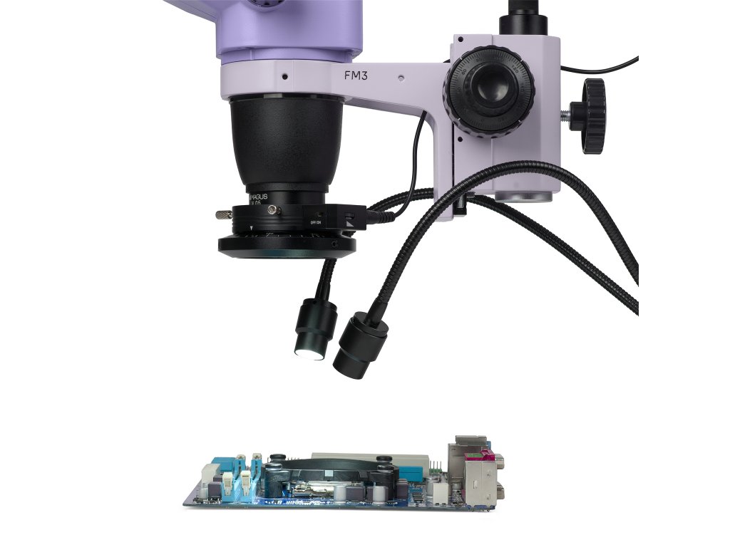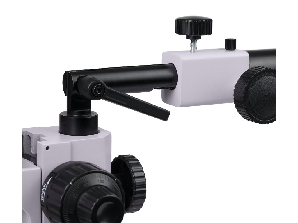 At the end of the stand, there is a mechanism to change the angle of the optical axis. The operator can observe the specimen that is on the table, looking at it from an angle. This feature makes it more convenient to perform manipulations, check the soldering quality, and observe curved objects.