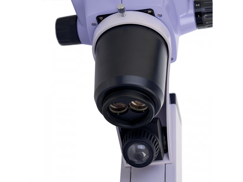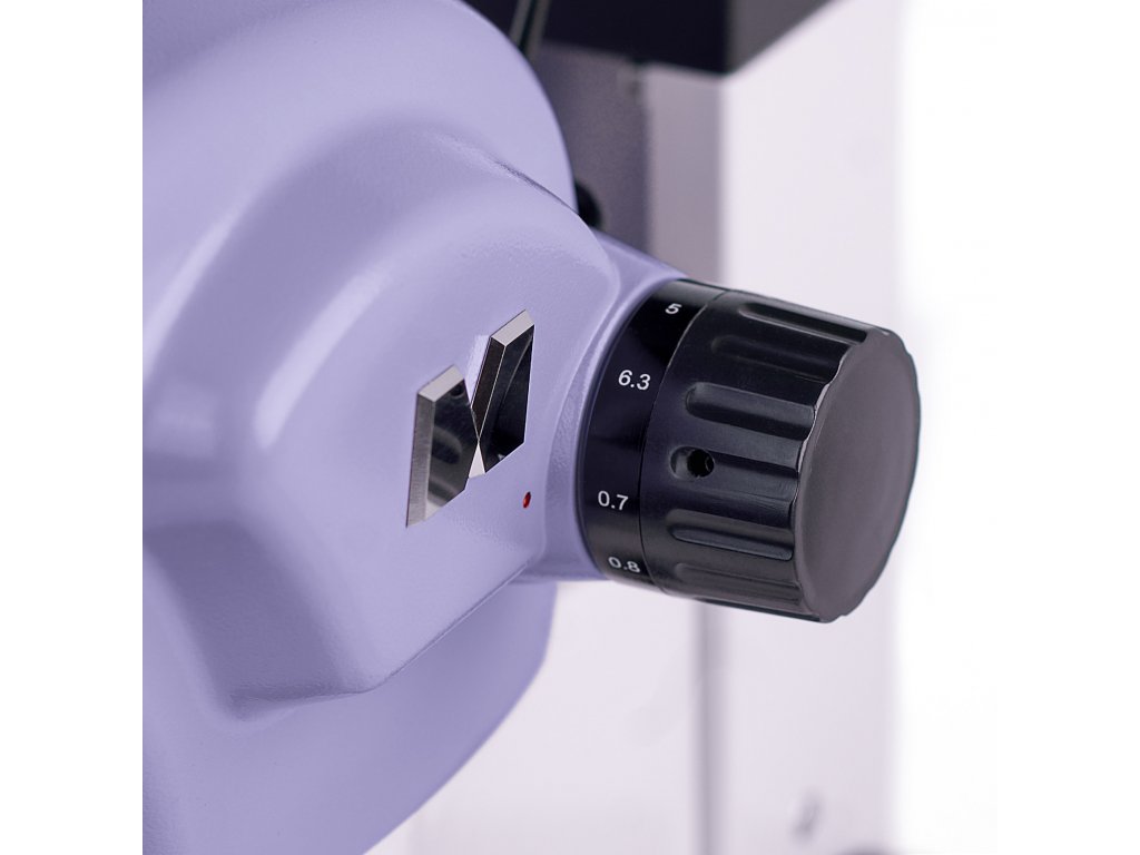 Mikroskop vlastní trinokulárnu hlavicu s trinokulárnou trubicou do ktorej sa môže inštalovať digitálna kamera. Adaptér C-mount sa nachádza v balení, ale digitálny fotoaparát je potrebné si zakúpiť. Trinokulárna hlavica sa dá otáčať o 360°. Objektív so zoomom je kombinovaný s okulárom s 10 násobným zväčšením a poskytuje zväčšenie od 7x do 63x. Zásluhou zoom objektívu je, že zväčšenie sa mení bez zníženia ohniska. Ak používate voliteľné objektívy, ktoré nie sú súčasťou balenia, môžete zmeniť rozsah zväčšenia, pracovnú vzdialenosť a zorné pole mikroskopu. S voliteľným príslušenstvom, tak môžete zvýšiť zväčšenie až na 315x.