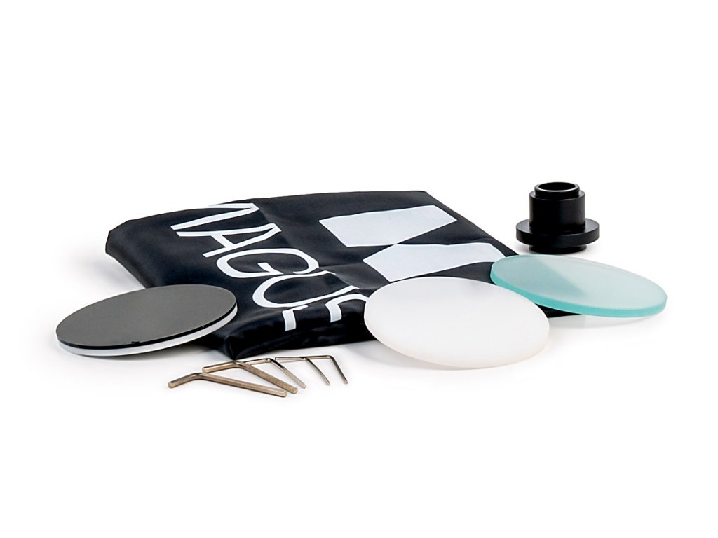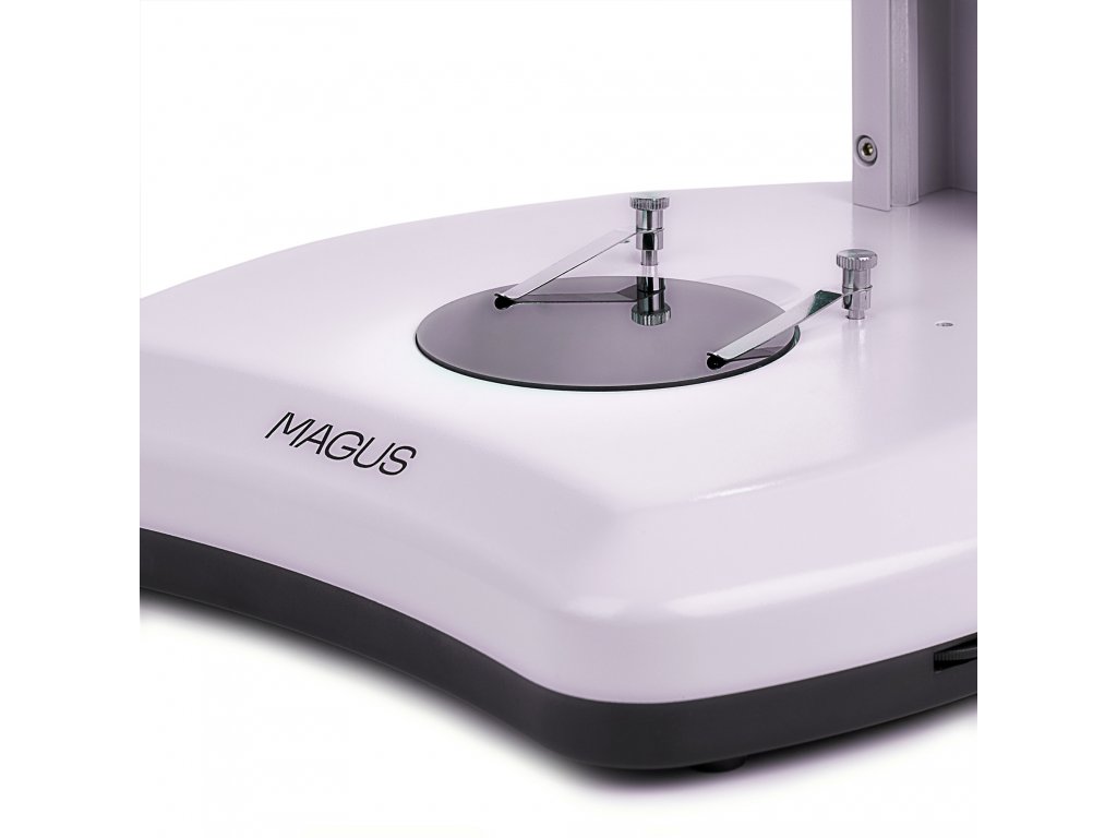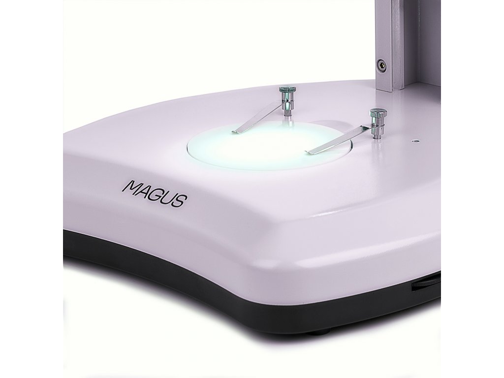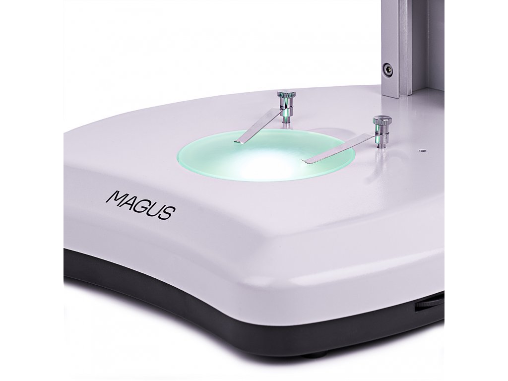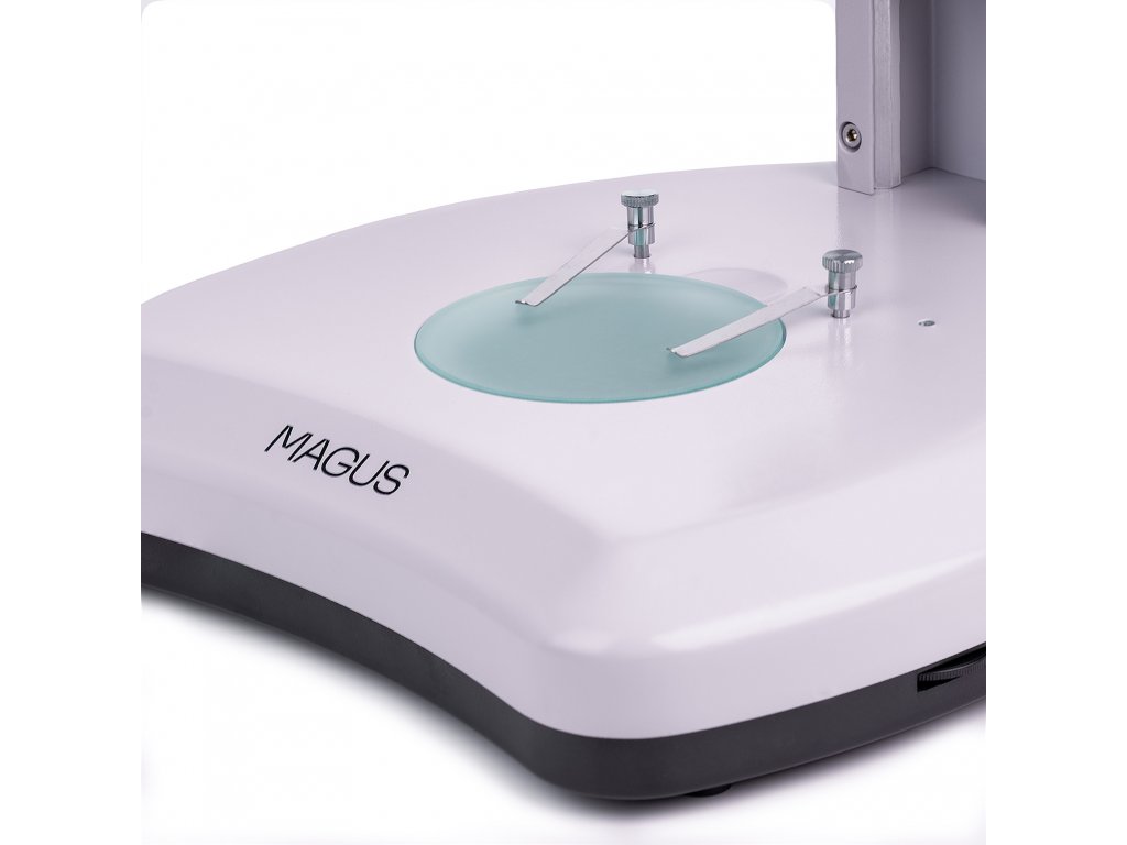 Jedna z priložených dosiek je namontovaná priamo na pracovnom stolíku. V balení sa nachádzajú obojstranná čiernobiela doska, biela a priehľadná. Prvá doska sa využíva na pozorovanie nepriehľadných vzoriek a tvorí vysoko kontrastný obraz. Preparáty tmavej farby sa skúmajú na bielej strane dosky, zatiaľ čo vzorky svetlých farieb sa skúmajú na čiernej strane dosky. Biela a priehľadná doska sa využíva, keď potrebujete skúmať priesvitné a priehľadné preparáty, a chcete dosiahnuť maximálny jas a rovnomerné osvetlenie pracovnej plochy. Mikroskop MAGUS Stereo 9T disponuje mechanizmom hrubého a jemného zaostrovania. Jemné zaostrovanie je vhodné používať pri zväčšení nad 40x. Hrubé zaostrovanie má k dispozícii nastavenie napätia.