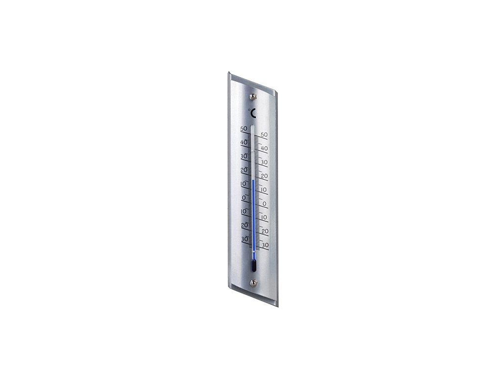 Vonkajší kovový teplomer Strend Pro meria teplotu v rozsahu od 50°C do -30°C. Rozmery: 230x50x15 mm.
