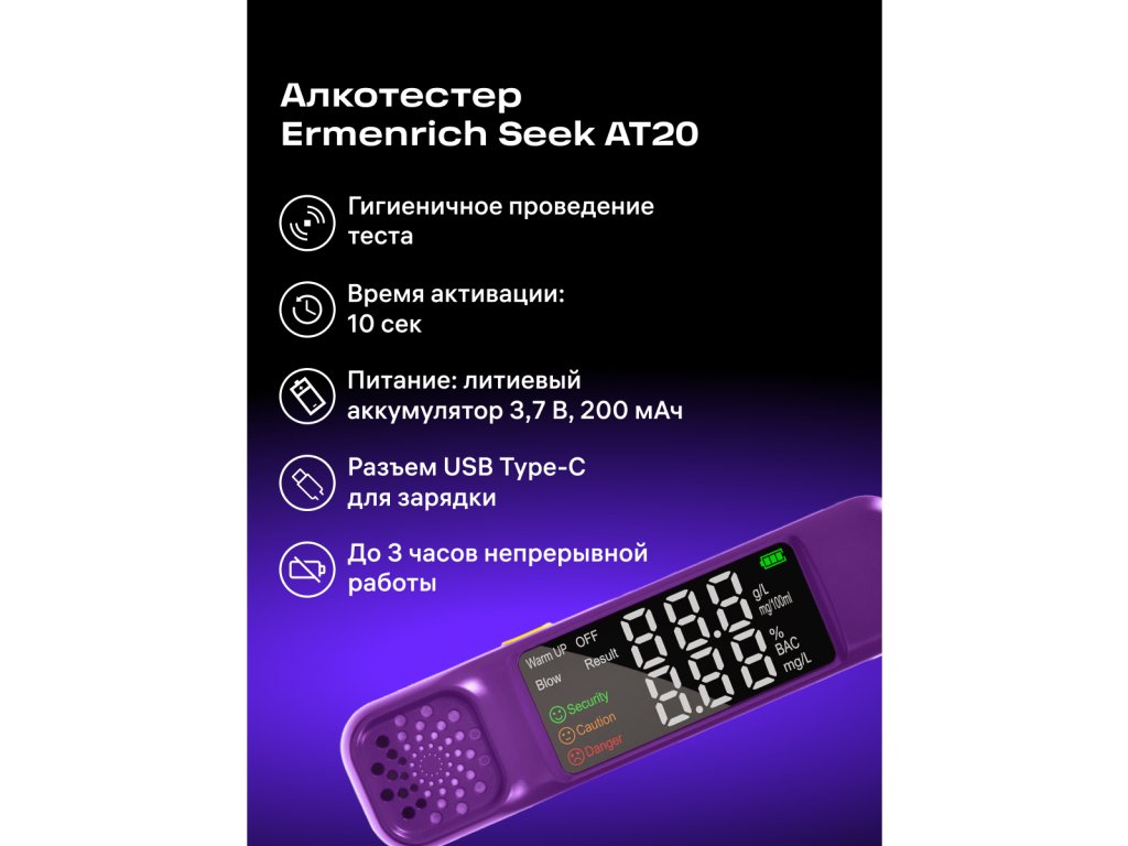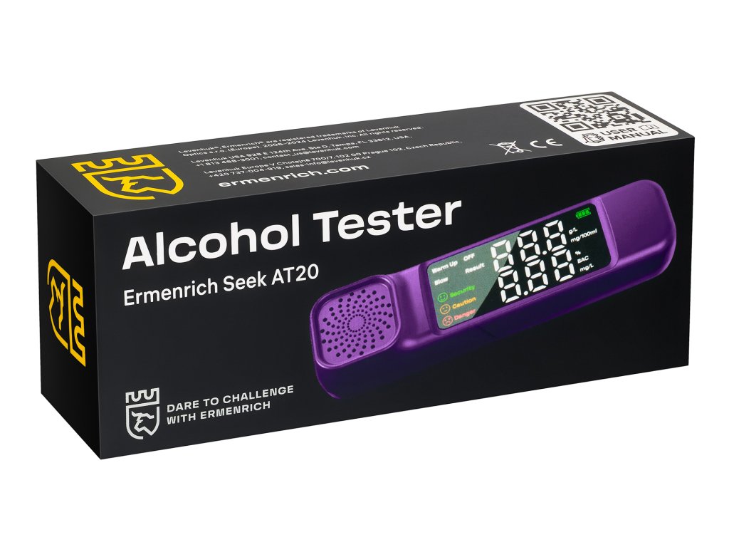 Ermenrich Seek AT20 je moderný alkohol tester s bezkontaktným senzorom, určený na presné meranie hladiny alkoholu v krvi na základe vydychovaného vzduchu. Tento prístroj je ideálny pre osobné aj odborné testovaniehladiny alkoholu, a to v rozsahu 0–0,19 % BAC (koncentrácia alkoholu v krvi) alebo 0–1,9 g/l. Aby bol test správne vykonaný, je potrebné vykonať 10-sekundový výdych.Hlavnou výhodou tohto testeru je absence náustka, čo znamená, že nie je potrebné sa dotýkať úst, čo robí test hygienickým a bezpečným. To je obzvlášť dôležité pri testovaní viacerých osôb po sebe. Tester je pripravený na použitie už po 10 sekundách zo zapnutia, čo šetrí čas a zabezpečuje rýchle výsledky.