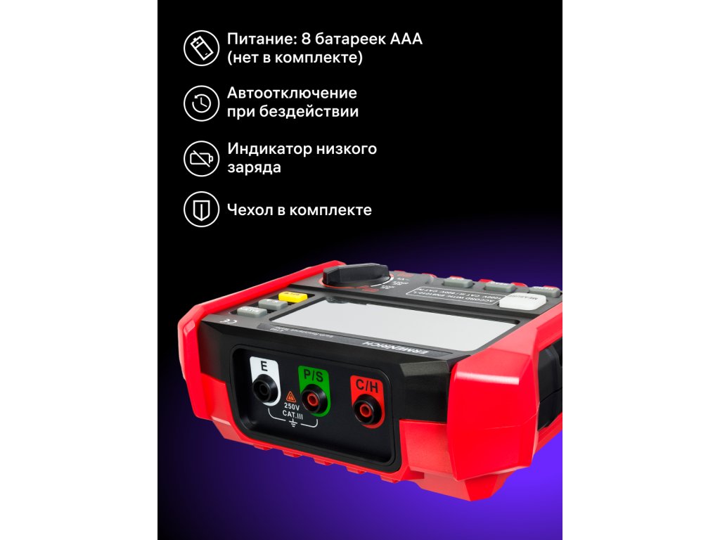 Ermenrich Ping ET60 je merací prístroj, ktorý je určený na testovanie elektrických rozvodov, projektovanie systémov ochrany pred bleskom, diagnostiku stožiarov vysokého napätia, budov, komunikačných staníc, vnútorných rozvodov, elektrických zariadení atď. Tester zemného odporu má vysokú presnosť merania a je vhodný na použitie pre profesionálov.