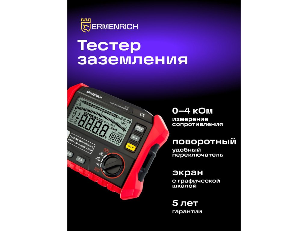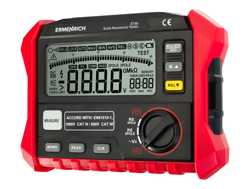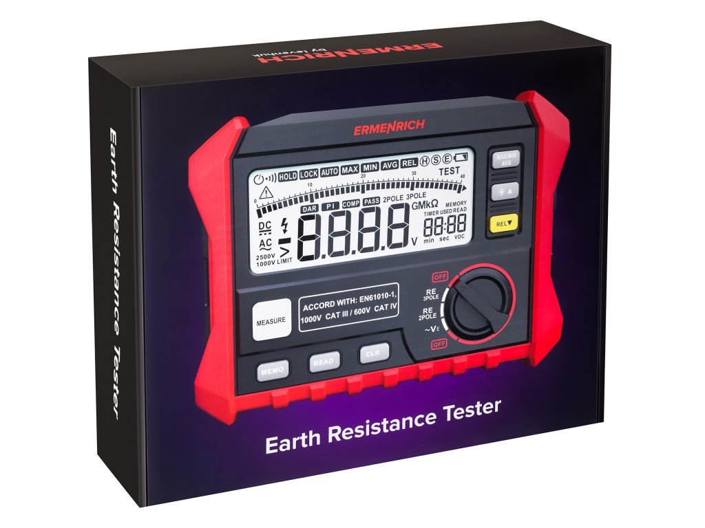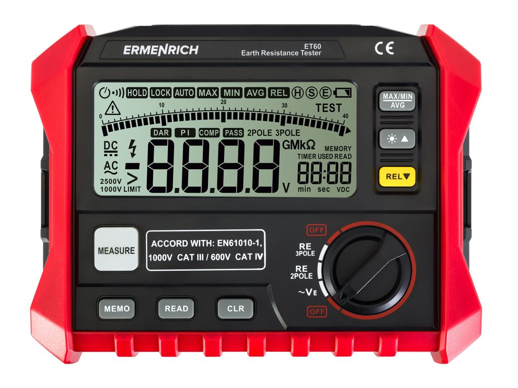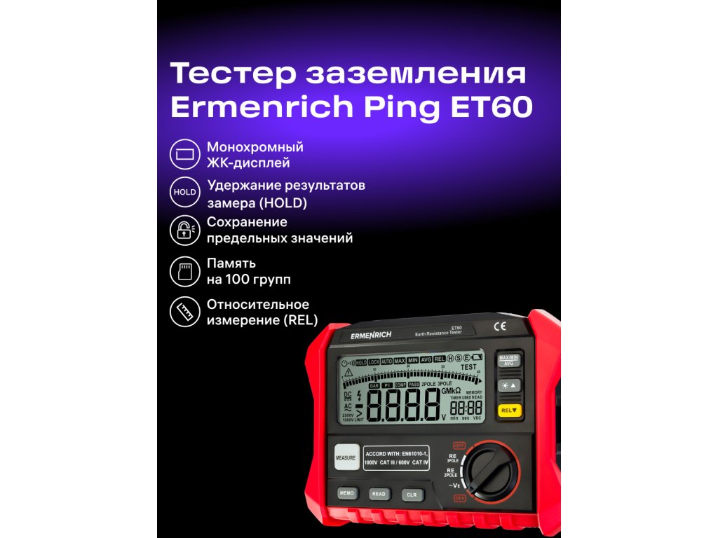 Merač zemného odporu Ermenrich Ping ET60 je tester, ktorý je vhodný na meranie zemného odporu v rozsahu do 0 až do 4 kΩ. Disponuje vstavaným LCD displejom, tromi testovacími káblami rôznych dĺžok a dvoma uzemňovacími tyčami. Tester zemného odporu je napájaný prostredníctvom batérie. Má funkciu automatického vypnutia a upozorní vás na nutnosť výmeny batérií, pokiaľ ich kapacita nebude dostatočná. Meranie a diagnostiku merača sa odporúča vykonávať pri vysokej úrovni kapacity batérie, pretože môže dôjsť k chybným výsledkom.