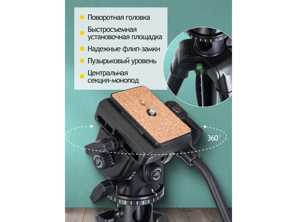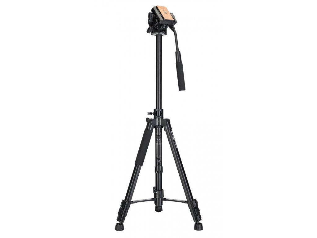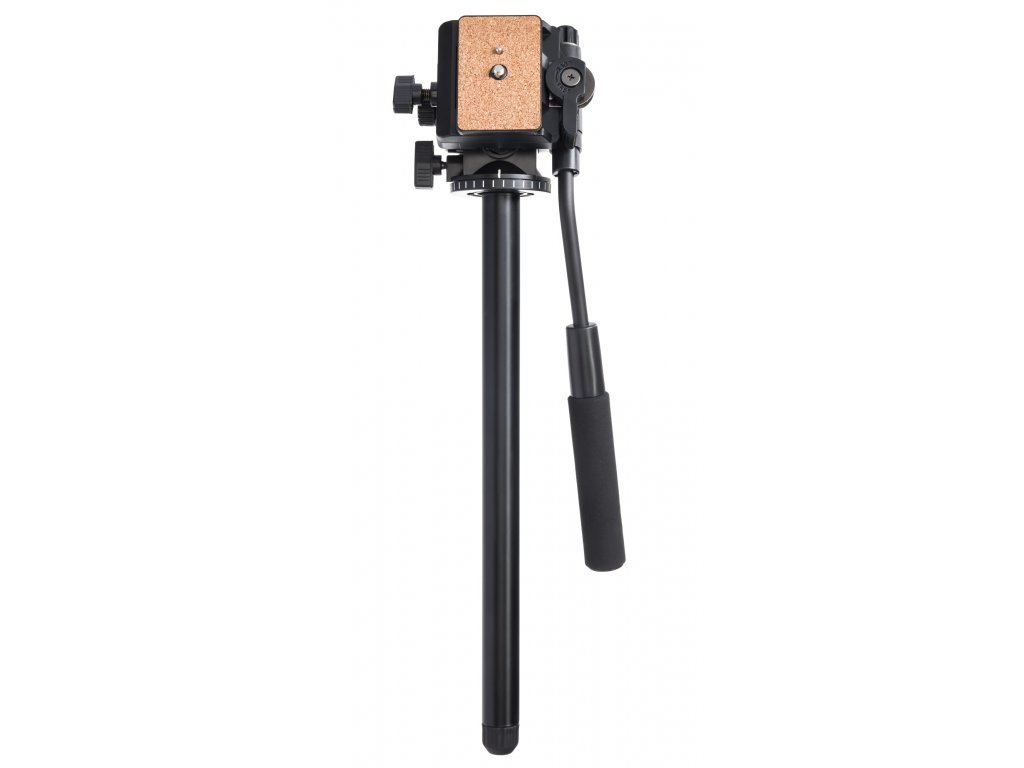 Rýchloupínacia doska výrazne skracuje čas, ktorý je potrebný na montáž, výmenu a demontáž zariadení zo statívu. Otočná a sklopná hlava je vyrobená z odolného plastu, vďaka čomu môžete zariadenie nastaviť do perfektného uhla snímania, aby ste dosiahli správny uhol alebo správny smer svetla. Plošinou môžete otáčať alebo ňou nakláňať za pomoci rukoväte. Stredový stĺpik tripodu môžete používaj aj ako ručný monopod alebo vodorovný stĺp na natáčanie videí alebo fotografovanie.