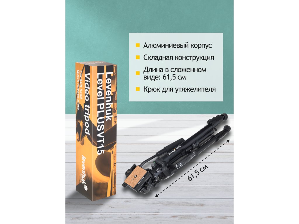 Výšku statívu môžete nastaviť vysunutím nôh alebo zvislým posunutím stredového stĺpika vo výške od 590–1815mm. Nožičky sú bezpečne fixované silnými flipovými zámkami flip-lock. Pre ešte väčšiu stabilizáciu statívu Levenhuk Level PLUS VT15 môžete použiť závažia, ktoré sa umiestňujú na špeciálny háčik, ktorý je súčasťou tripodu. Pogumované nohy zabraňujú skĺznutiu statívu a zabraňujú poškodeniu podlahy. Zabudovaná bublinková vodováha vám bude nápomocná pre rovné umiestnenie statívu a namontovaného zariadenia.