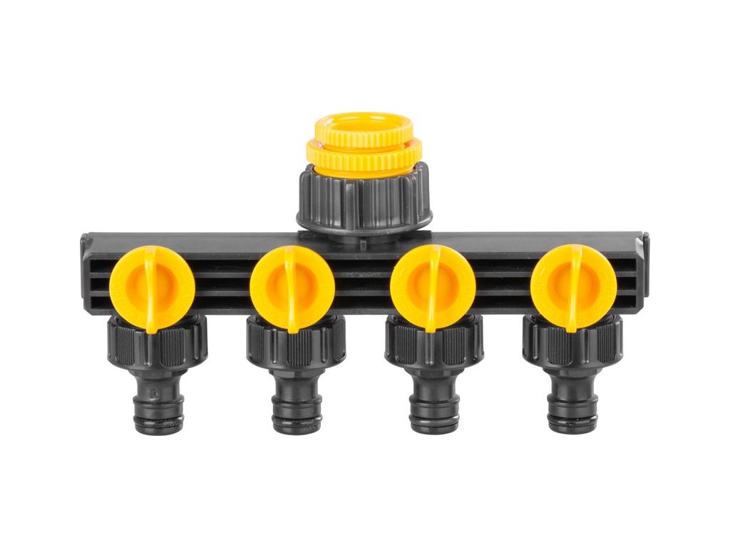 4-cestná záhradná rozvodka na pripojenie k vodovodnému kohútiku. Možnosť pripojiť až 4 vodovodné príslušenstvá, prietok vody je regulovateľný a uzatvárateľný. Vhodné pre 1/2" - 3/4".